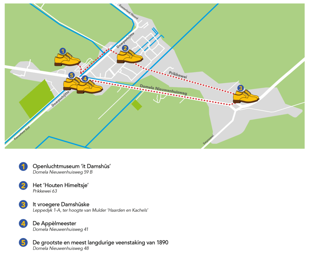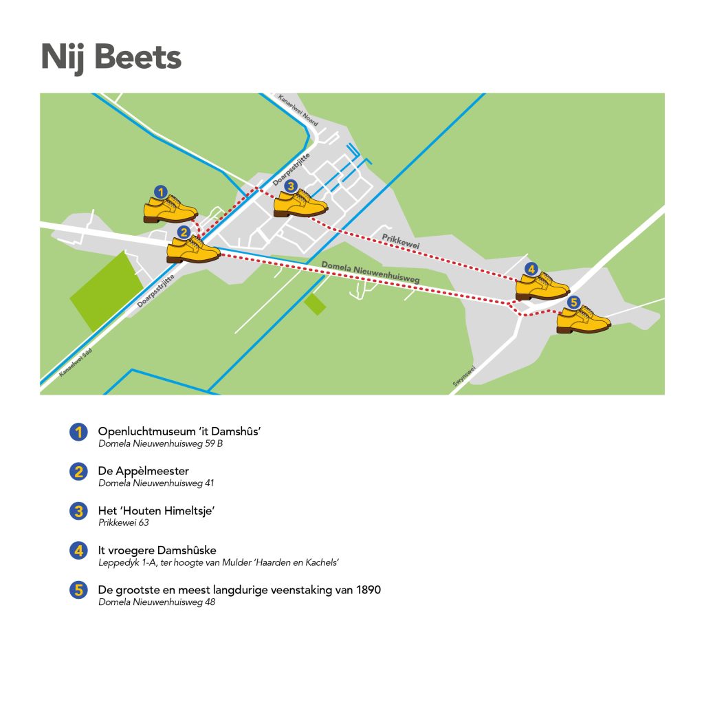In samenwerking met It Damshus hebben we een wandelroute samengesteld, langs de hoogtepunten van het revolutionaire karakter van Nij Beets. Op verschillende plekken in de stad staan er gele schoenen opgesteld. Scan de QR-code bij de schoen en duik in de bijzondere geschiedenis van dit dorp.