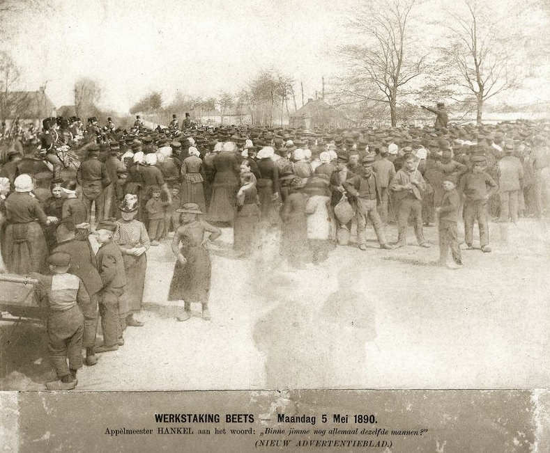 “De rust In de veenderijen is in hoge mate verstoord. De tegenwoordigheid van de militaire macht is daarbij noodzakelijk”, schreef de politie toen in 1890 aanhoudend appèlbijeenkomsten waren. Koortsachtig overlegden de veenbazen, want uit een steeds grotere regio kwamen veenarbeiders toegestroomdEn toen, op maandag 21 april 1890, riep het arbeidersvolk opgewonden: ‘Ús ferlosser komt!’ Massaal trok het arbeidersvolk naar de appèlplaats bij het café van Evert Dam. (nu café de Brêge), waar kamerlid Domela Nieuwenhuis, samen met zijn zoon en Tjeerd Stienstra, al om 12 uur arriveerde. De infanterie en de marechaussee bewaakten de orde. 2000 tot 2500 stakers waren samengestroomd(!) Later trok men gezamenlijk naar café de Wit, nu Medisch Centrum de Hoek. Aan de muur van de herberg hing een tekst: ‘LEVE DOMELA NIEUWENHUIS, RECHT EN BROOD VOOR ALLEN’ Toen Domela beloofde 100 gulden in de weerstandskas te storten, stonden velen met tranen in de ogen. Uit volle borst klonk het strijdlied: “Ontwaakt, verworpenen der aarde!”